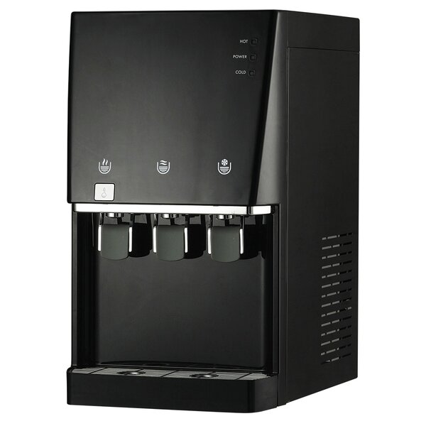 Compact water dispenser, designed for small spaces, equipped with three dispensers that provide cold, room temperature and hot water.
